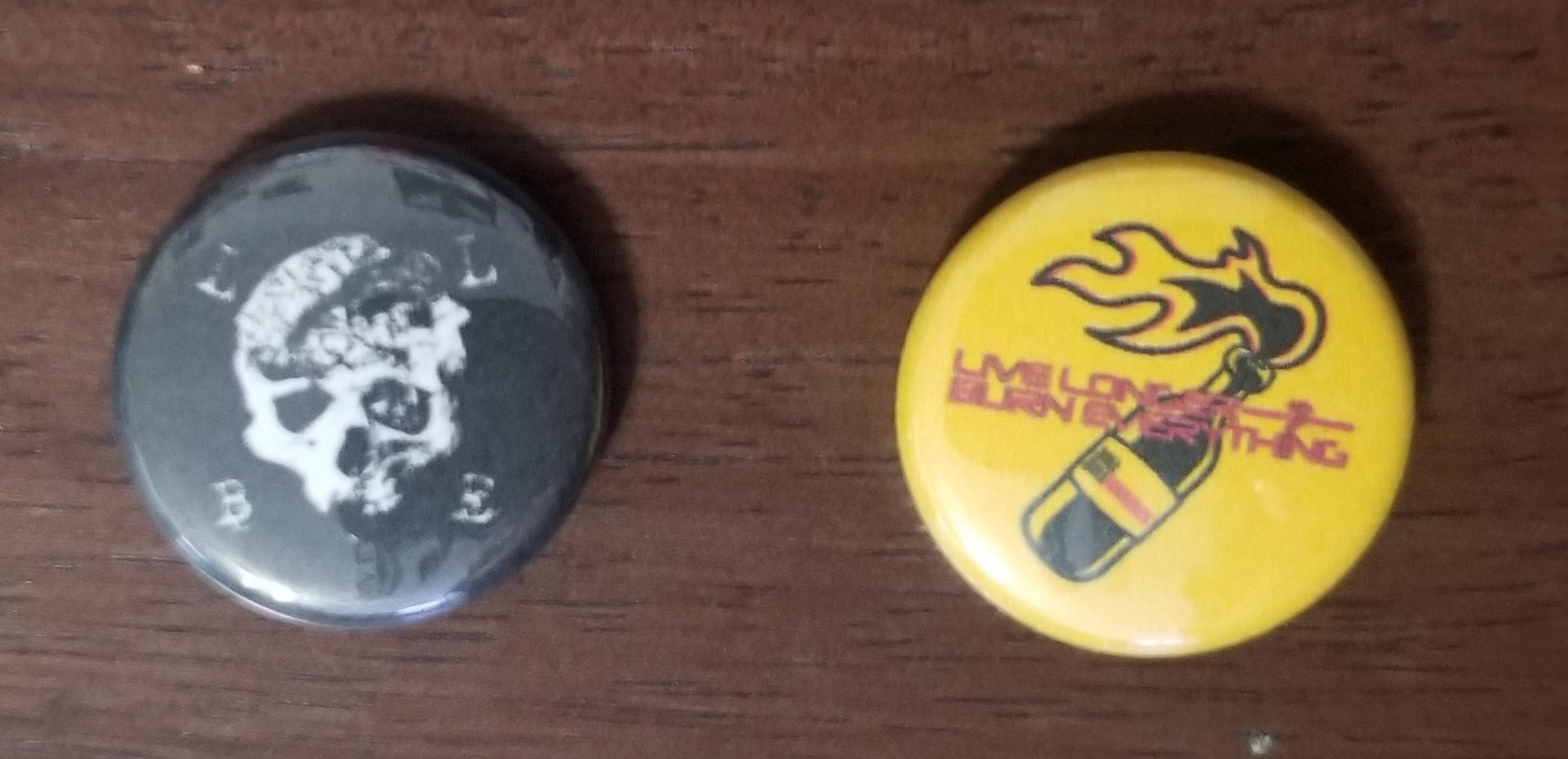 Yellow and Black button pins designed by LLBE, made by Edie Quinn of Middle-Man Records, Indiana.