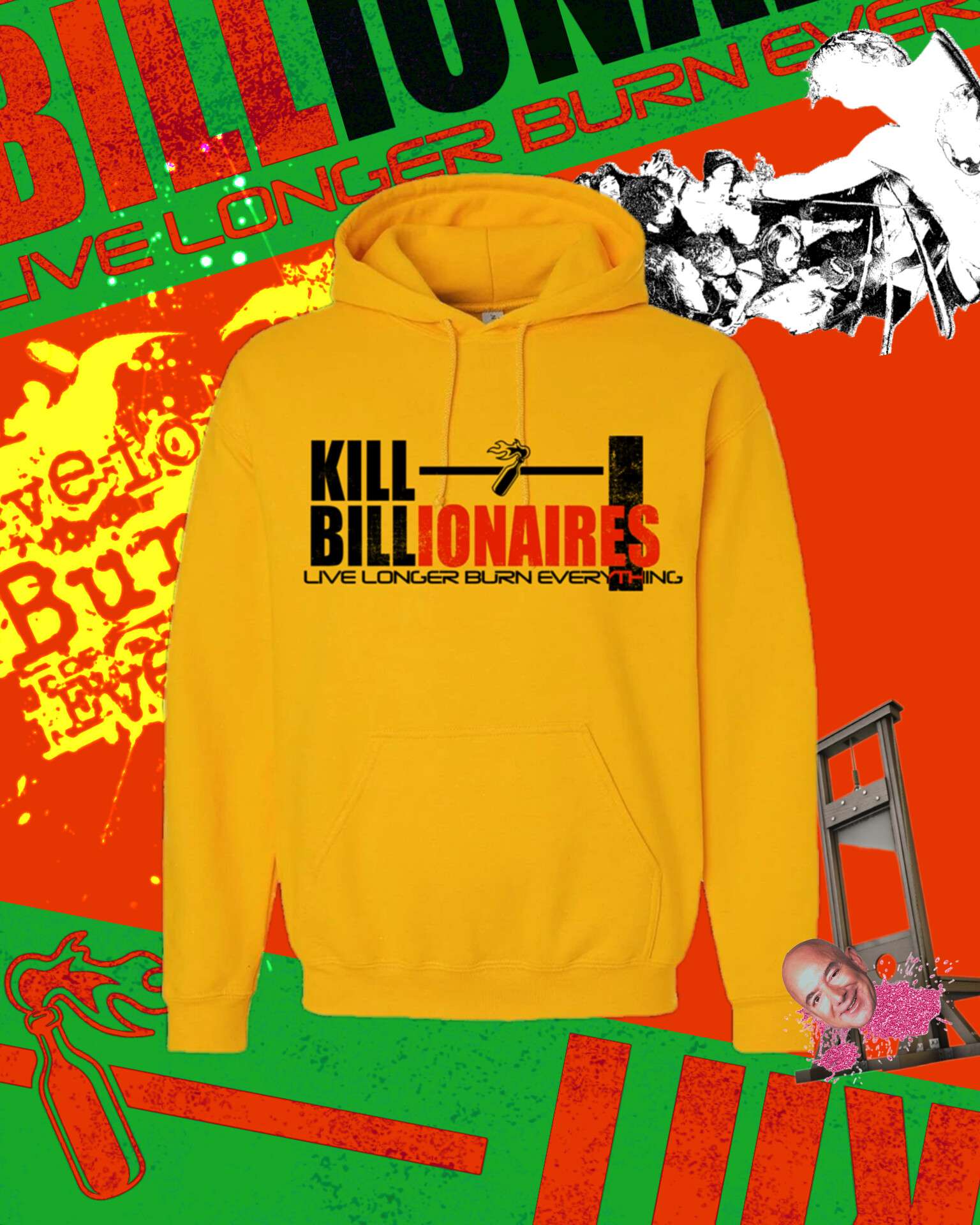 Kill Billionaires design by Ryan Peterson (@punkrockeaglescout). printed on Gold Lane 7 pullover hoodies by Kaos Merch in Mesa, Arizona.